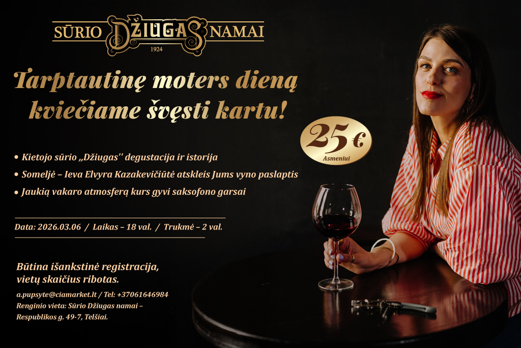 Tarptautinė moters diena sūrio Džiugas namuose! Išskirtinė sūrio ir vyno degustacija – raktas į skonių, žinių ir jaukumo vakarą.
